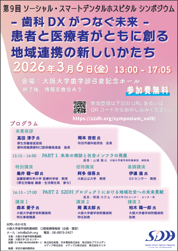 第9回ソーシャル・スマートデンタルホスピタル(S2DH)シンポジウム を開催いたします。本シンポジウムでは「-歯科DXがつなぐ未来- 患者と医療者がともに創る、地域連携の新しいかたち」をテーマに、共感を軸とした歯科医療のデジタル変革について議論を深めます。どなたでもご参加いただけますので、ぜひご参加ください。途中入退場も可能です。 開催概要 開催日:2026年3月6日(金)開催時間:13:00~17:05場所:大阪大学歯学部F棟5F 弓倉記念ホール参加費:無料申込締切:2026年2月27日(金) リンク 参加登録はこちら (S2DH Webサイト)https://s2dh.org/author/s2dhstaff/ リンク 【お問い合わせ】大阪大学歯学部附属病院 口腔医療情報部E-mail:info@s2dh.orgTEL: 06-6879-2427https://hospital.dent.osaka-u.ac.jp/departments/division-for-oral-dental-informatics/